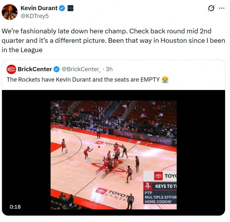 天博体育官网-主场现大量空座?KD解释:第二节中段才满座 休斯敦一直都是这样